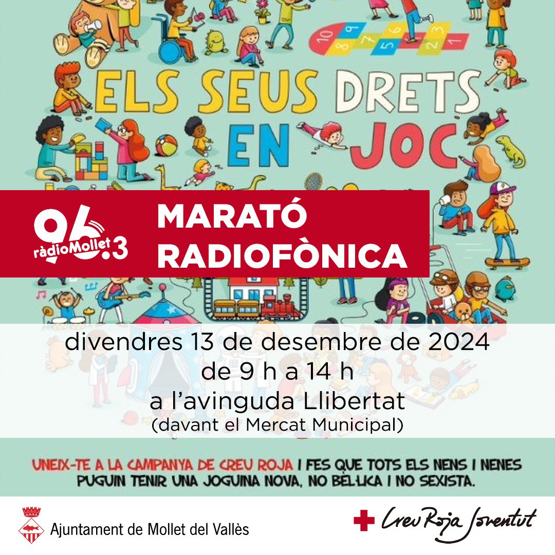 Aquest divendres 13 de desembre, Ràdio Mollet (96.3 FM) organitzarà un any més la marató radiofònica de recollida de joguines per a la campanya, cap nen sense joguines de Creu Roja, on entitats i ciutadania poden fer les seves donacions