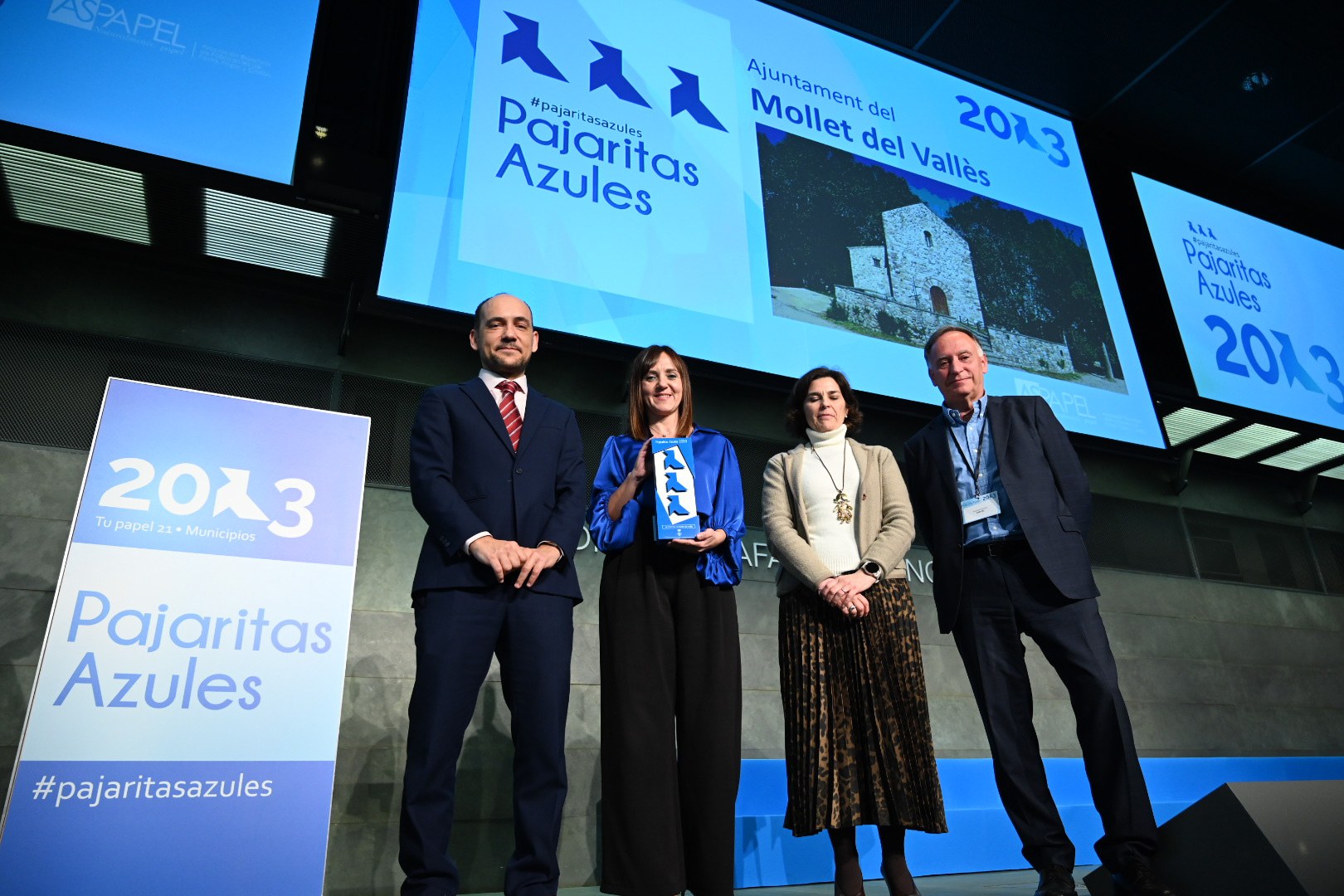 La Asociación Española de Fabricantes de Pasta de Papel y Cartón (ASPAPEL) ha entregado este jueves en Madrid los premios Pajaritas Azules 2023 que han distinguido a 46 ayuntamientos por su compromiso con el reciclaje del papel y el cartón. Mollet del Vallès ha sido una de las ocho ciudades catalanas premiadas (con Barcelona, El Prat de Llobregat, Lérida, Sant Boi, Castelldefels, Reus y Terrassa) al recibir el reconocimiento. Es el cuarto año consecutivo que ASPAPEL reconoce a Mollet con el máximo distintivo, tres Pajaritas Azules, así mismo también han recibido las tres Pajaritas Azules ciudades como Bilbao, Logroño, Segovia y Zaragoza, entre otros.