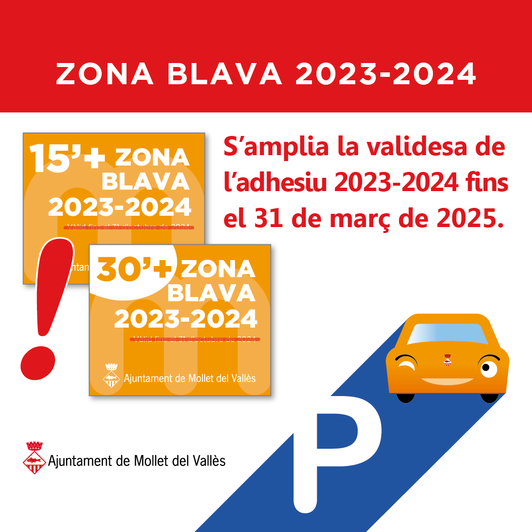 El Ayuntamiento de Mollet del Vallès amplía hasta el 31 de marzo de 2025 la vigencia de las pegatinas 2023-2024 para aparcar en la zona azul de la ciudad 15 y 30 minutos gratuitamente.